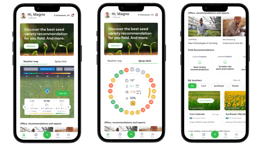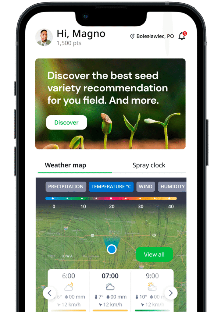The Spray Radar feature encourages users to regularly open the app by highlighting the optimal moments for spraying and irrigation. We also implemented a voucher system for seeds and crop-protection products, further supporting farmers throughout the season.