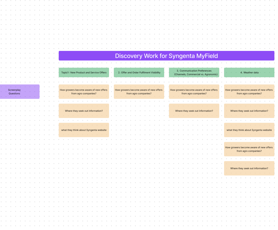 I conducted interviews with internal teams across Europe and the Middle East and end users of Syngenta’s weather and monitoring software to uncover needs, pain points, and motivations.