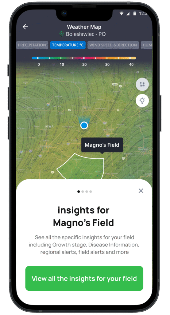 One of the app’s core features is the interactive map displaying climate data and meteorological information, giving farmers advanced, region-specific weather insights.